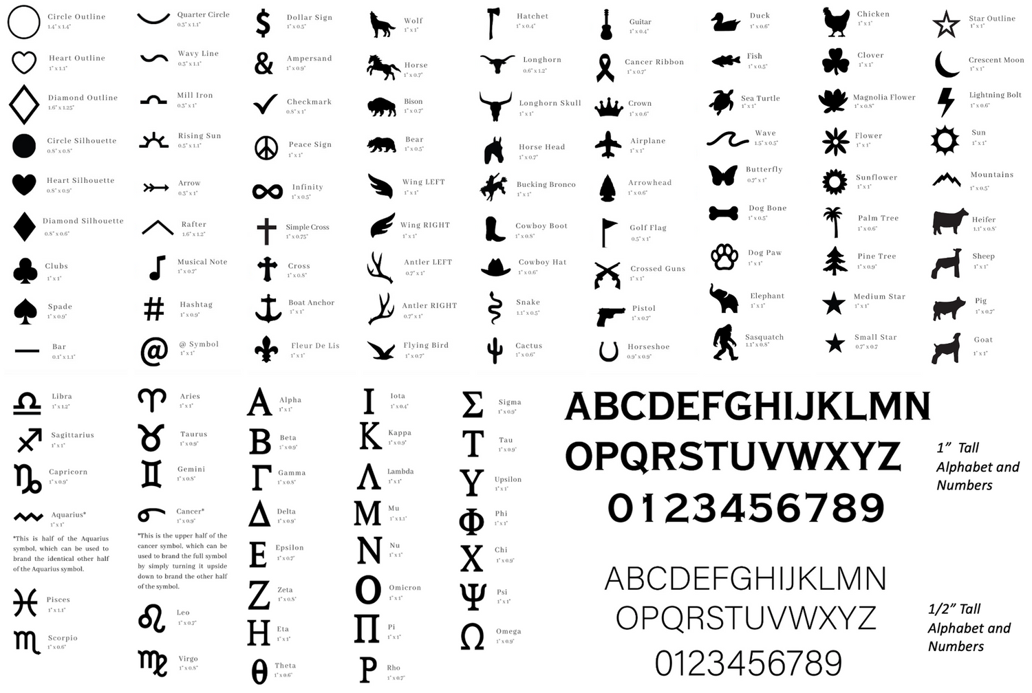Over 190 branding irons to customize your gear.